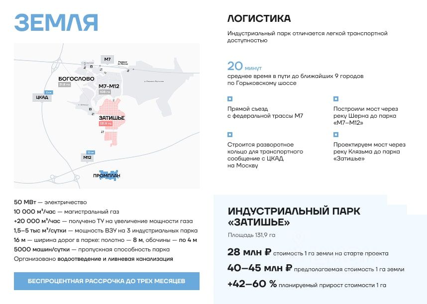 Продажа земли промышленного назначения в индустриальном парке Затишье, Московская область, Богородский округ, поселение Буньково. Общая площадь участка: 1,5 га. Поле ровное, сухое, не имеет заболоченных участков. Цeна за сотку: 260 000 руб. Документы на участок предоставляются по запросу. При необходимости подберем альтернативные участки в данной локации. Общая площадь парка Затишье: 131,9 га. Расположение: 48 км от МКАД Рядом ЦКАД (2 км), М12 (7 км), БКЛ (20 км) Коммуникации: Электричество — до 20 МВт, II категория, льготный тариф Газоснабжение — до 10 000 м/сутки Водоснабжение и канализация — до 500 м/сутки Ливнёвка, ВЗУ, насосная станция, пожарные резервуары Подходит под инвестиционный проект.