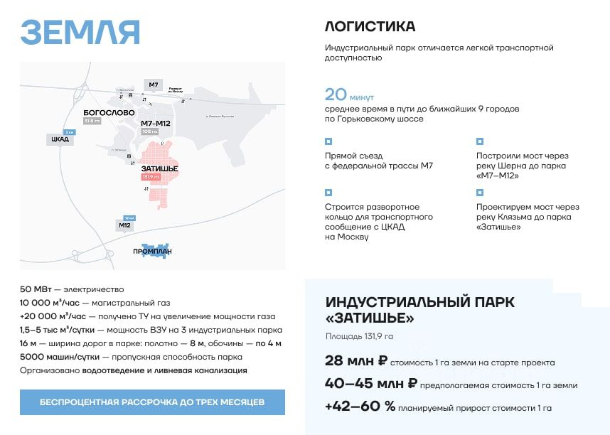 Продажа земли промышленного назначения в индустриальном парке Затишье, Московская область, Богородский округ, поселение Буньково. Общая площадь участка: 1,5 га. Поле ровное, сухое, не имеет заболоченных участков. Цeна за сотку: 260 000 руб. Документы на участок предоставляются по запросу. При необходимости подберем альтернативные участки в данной локации. Общая площадь парка Затишье: 131,9 га. Расположение: 48 км от МКАД Рядом ЦКАД (2 км), М12 (7 км), БКЛ (20 км) Коммуникации: Электричество — до 20 МВт, II категория, льготный тариф Газоснабжение — до 10 000 м/сутки Водоснабжение и канализация — до 500 м/сутки Ливнёвка, ВЗУ, насосная станция, пожарные резервуары Подходит под инвестиционный проект. Позвоните, расскажем подробности и организуем показ на месте.